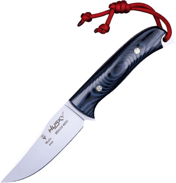 A Muela Husky már biztos helyet szerzett magának a szabadtéri és bushcraft szektorban. A kellemesen kontúrozott és mart Micarta markolat kényelmesen illeszkedik a kézbe, és biztonságos érzést nyújt. A spanyol gyártó modern hangsúlyt ad ezzel a fekete és kék változattal. A Böhler N690 acélból készült, szatén felületű penge lapos csiszolású, és univerzális formájának