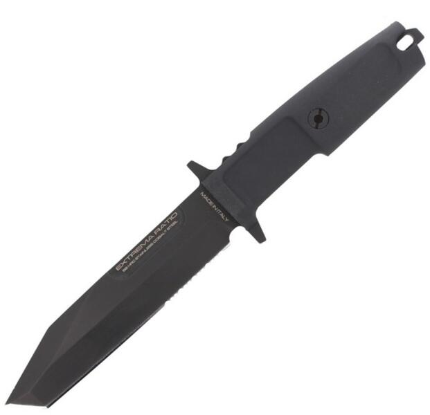 Rövidebb és könnyebb harci kés Extrema Ratio FULCRUM S BLACK rögzített pengével, Bohler N690 acélból, részleges rétegekkel, matt fekete, fényvisszaverő felülettel. MIL-C-13924 BURNISHING. A fogantyú tartós csúszásgátló, fekete színű Forprénből készül. Nylon tokban van.