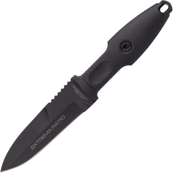Taktikai sporttőr Extrema Ratio PUGIO egyszéles FEKETE szilárd, egyoldalas pengével, Bohler N690 acélból, fekete, nem tükröződő felülettel. A fogantyú csúszásgátló alakú Forprén fekete színű, egy lyukkal a húrhoz. Műanyag tokban van.