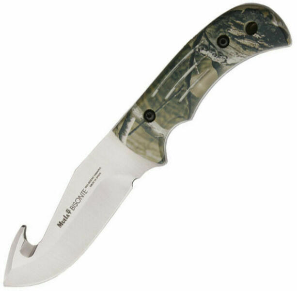 Vadászkés Muela Bisonte-11AP, amely alkalmas fogott vadfeldolgozásra. Rögzített, teljesen illeszkedő pengével (áthalad az egész késsel), a penge végén gőzölővel, amely 60E molibdén-vanádium acélból készül, 57-61 HRC keménységgel. Anatómiailag formázott, lágyított műanyagból készült fogantyú Realtree álcázási motívummal, lyukkal a húrhoz. Nylon tokban érkezik.