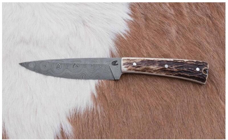 A kés kézzel készült, kiváló minőségű anyagokból, és minden darab eredeti. A penge nagyon dekoratív damaszkuszi acél mozaikokból van kovácsolva. A kés markolatához szarvasagancsot használtak. A penge hossza: 12,1 cm. Teljes hossz: 22,4 cm. Markolat: szarvasagancs. Pengéje: Damaszkuszi mozaik. Nem mosogatógépben mosható. Csak nedves ruhával mossuk és hagyjuk megszáradni. A