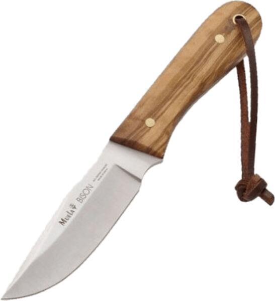 Termék részletekA kisebb univerzális vadkés kés, a Muela BISON-9. OL, amely szintén alkalmas a természetben tartózkodásra, szilárd pengével rendelkezik, sima peremmel, molibdén-vanádium acélból készül. A penge hátuljában egy csúszásmentes horony van a hüvelykujján, és mélyedése az mutatóujjnál az alján. Ez egy teljes méretű kés - egy darab acélból készül. A fogantyú olajfa fáb