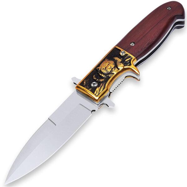Termék részletekCOLUMBIA Outdoor összecsukható kés-23/12,5cm Különleges összecsukható zsebkés a legjobb minőségű anyagokból. Tökéletesen kézbe illik, kiváló munkaeszköz. Mindennapi használatra. A markolata leopárd ábrázolással díszített. Ideális társ outdoor-tevékenységek kedvelőinek, halászoknak vagy vadászoknak. A kés nyomógombos zárszerkezetű - biztonsági záras, amelynél