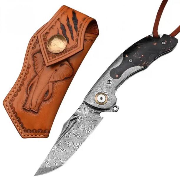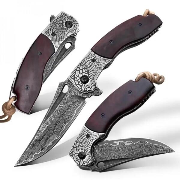 MASTERPIECE Yoshiko damaszk összecsukható vadászkés Minőségien kidolgozott, kézzel készített összecsukható kés damaszk acélból (damascene steel). A pengéje rétegelt acélkompozitos kovácsolással készült. Ennél a késnél ez 110 réteget jelent. Ezzel a kovácsolási technikával egyedi minta jön létre. Ezen rétegek közé VG10 acélmagot tettek. A kés keménysége 60-62 HC