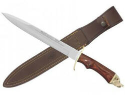 Termék részletekNagy vadászkés Muela ALCARAZ-26N, amelynek mérete és alakja hasonlít egy kis kardra. A szilárd penge molibdén-vanádium acélból készül, 58–61 HRC keménységű, sima, tőr alakú éltel. A pajzs kétoldalas, fém arany színű, elegánsan hajlított. A fogantyú agancsból készül, sarka pedig egy vaddisznó fejének gyönyörű fém szoborából készült, szintén aranyban. A késh