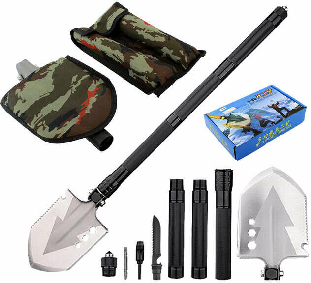 Termék részletekTöbbfunkciós túlélőkészlet, összecsukható lapát, acél, 16 elem, fekete/ezüst színA többfunkciós összecsukható lapát minden olyan felhasználó igényeit kielégíti, aki szereti szabadidejét a természetben tölteni. A többfunkciós lapát kiválóan alkalmas kempingezésre, kutató expedíciókra vagy a kertben is használható. A lapát acélból készült, a nyél fogazott fe
