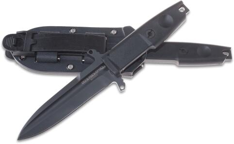 Termék részletekA Scout kés harci verziója az Extrema Ratio DEFENDER 2 DG BLACK rendkívül vékony alakjával egy Bohler N690 acélból készült szilárd pengével, fekete bevonattal, az egész képen áthalad (teljes ütés). Kettős védőeleme van a kézvédelemhez. A fogantyú tartós és csúszásmentes, fekete fekete Forprénből készült, egy lyukkal a húrhoz. A Kydex tokkal, amely kompatibilis a MOL