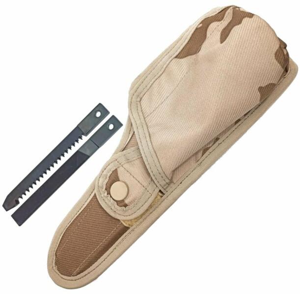 Termék részletekMinőségi textil terepszínű tok UTON késekhez a MIKOV gyártótól. A tok rendelkezik egy zsebbel a tartozékok számára és egy moduláris hordozórendszerrel a tok felakasztásához, beleértve a fém betétet, amely megakadályozza a tőr kiesését. A tok fedett, fűrésszel, reszelővel és zöld paracorddal van felszerelve. A fűrész és a reszelő szénacélból készült.
