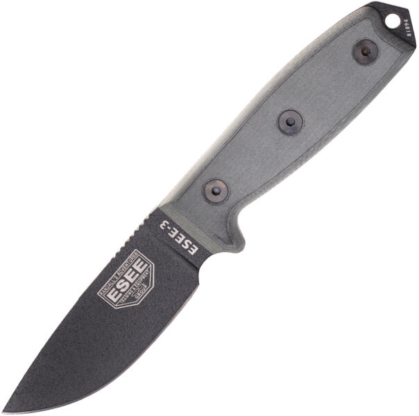 ESEE Knives 3P-MB-B Model 3 black blade, grey handle with sheath + clip and MOLLE-back A 3. modell szilárd kés a túléléshez, szabadtéri tevékenységekhez, kempingezéshez és bushcraft tevékenységekhez. A penge 1095-től származó szénacélból készül. A pengén található tartós porbevonat védelmet nyújt az acélra jellemző nagyobb korrózió iránti fogékonyság ellen. Megfele