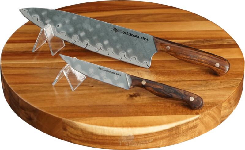 Ezt a Dellinger Kita észak-damaszkuszi késkészletet 2 darabból szinte minden konyhai feladatra tervezték, és bónuszként egy ingyenes kerek akác vágódeszkát is tartalmaznak. A kések 10Cr15C0M0V acélmaggal rendelkeznek, amelyet hat réteg damaszkuszi acél borít a kiváló tartósság és élesség érdekében. A kés nyele sivatagi vasfából készült, mely anyagot nagyra értékeli