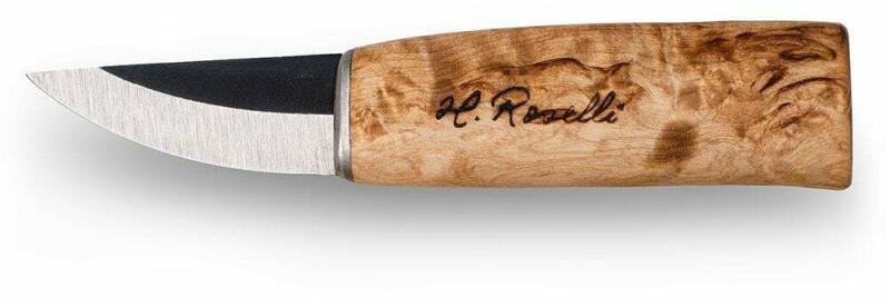 ROSELLI Grandmother knife, carbon R130 Roselli kis univerzális kés részletes házimunkához, famegmunkáláshoz vagy ételkészítéshez. A dizájn a hagyományos skandináv munkakéseken alapul, amelyek könnyedén megoldják az erdőben és a műhelyben végzett feladatokat. A penge kovácsolt szénacélból készül. A nyél göndör nyírfából készült, amelyet lenolajjal kezeltek - ez b