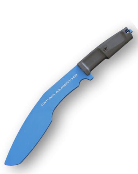 Az Extrema Ratio TK KS BLUE edzőkéssel / machete-val egy szilárd, teljesen illeszkedő penge van, amely áthalad az eloxált kék alumínium teljes késsel. A fogantyú fekete Forprénből készül. Gyűjtők számára is alkalmas.