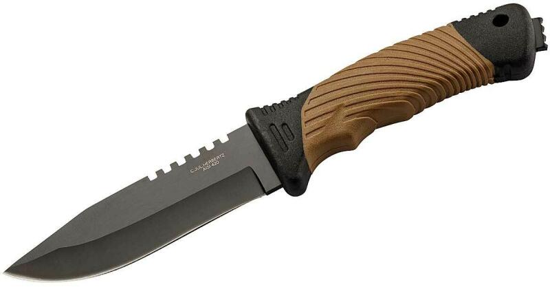 Herbertz robosztus külső kés, 420 rozsdamentes acél pengével, mindennapi használatra. A csúszásgátló műanyag-gumi kombinációból készült fogantyú biztosítja a biztonságos fogást munka közben. Ezenkívül üvegszerszám van beépítve a fogantyúba. A késhez műanyag tok tartozik, tároláshoz és szállításhoz.