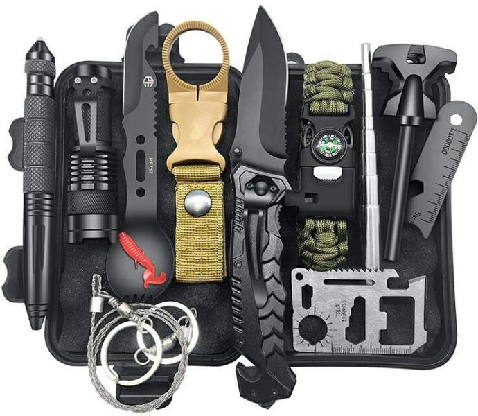 f48b turista túlélőkészlet 12 elemes. Turisták nélkülözhetetlen túlélőkészlete, amely 12 elemből áll. A készlet praktikus tokba van csomagolva. A készlet tartalma: kanál-villa késsel, fűrész és sörnyitó (a nyél jelzősípként szolgál), 11 az 1-ben túlélőkártya vonalzóval, fűrész, szögmérő, nyitó, egy penge stb. szálfűrész, toll üvegtörővel, nagy magnéziu