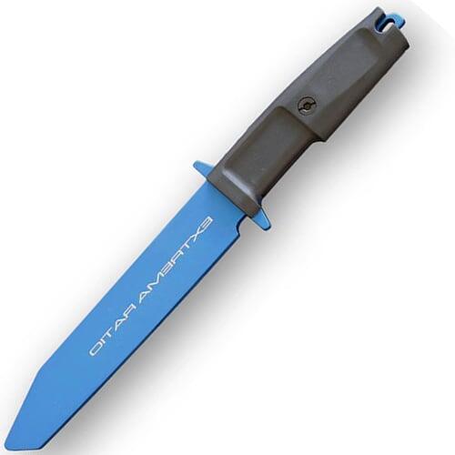 Edző kés Extrema Ratio TK FULCRUM BLUE rögzített, teljes nyelvű pengével, amely áthalad az egész képen sima, ferde szélű, kék eloxált alumíniumból. A fogantyú fekete Forprénből készül. Ez egyben gyűjtőcikkként is szolgál.
