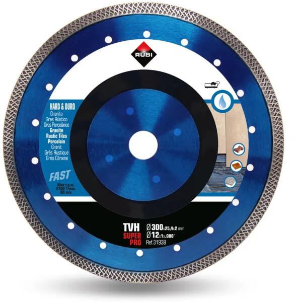 A legkeményebb anyagok nedves vágásához. Átmérő: 300 mm; furat: 25,4 mm; szegmensmagasság: 10 mm; szegmensvastagság: 2 mm. Ref: 31938