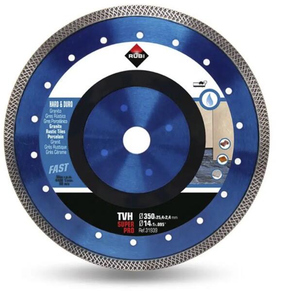 A legkeményebb anyagok nedves vágásához. Átmérő: 350 mm; furat: 25,4 mm; szegmensmagasság: 10 mm; szegmensvastagság: 2,4 mm. Ref: 31939