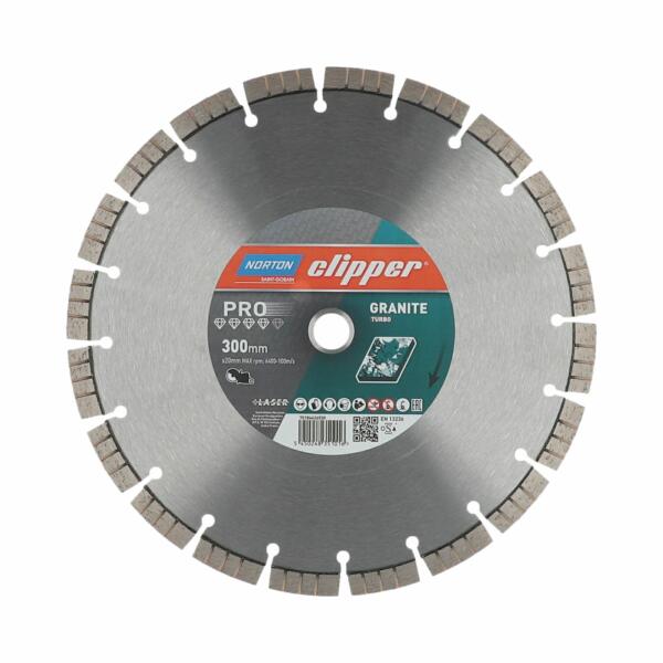 A Norton Clipper Pro Granite Turbo egy kiváló minőségű vágókorong, amelyet kifejezetten gránit és kemény kövek vágására terveztek. A tárcsa nagy pontosságú lézeres hegesztési eljárással készül, ami robusztus és megbízható konstrukciót eredményez. A szegmensek magassága 12 mm, ami nagyon hosszú élettartamot eredményez. A szegmensek hullámos formája jelentősen csö