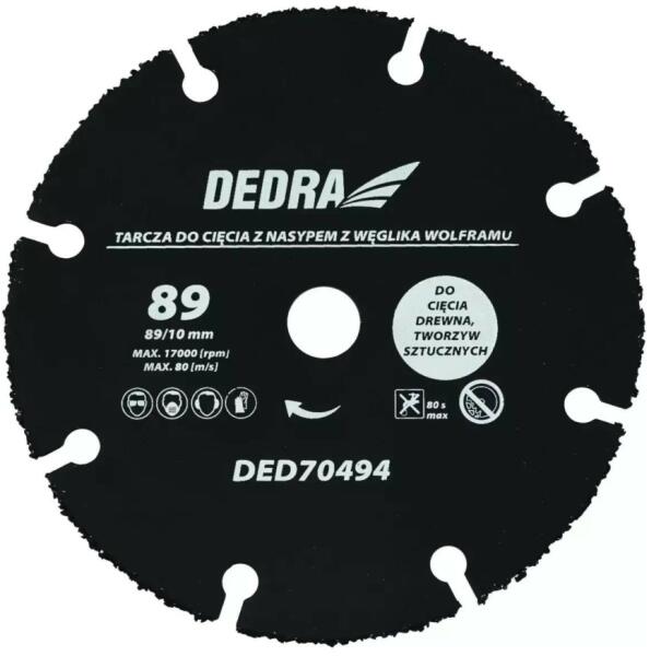 A tárcsát olyan anyagok hatékony vágására tervezték, mint a fa, a faalapú anyagok és a műanyagok. A penge testén alkalmazott volfrámkarbidnak köszönhetően a felhasználó a kezében egy olyan szerszámot kap a különböző anyagok vágásához, amely nem teszi szükségessé a megfelelő tartozékok folyamatos cseréjét. A lapot a DED7049 akkumulátoros minifűrészhez ajánljuk.