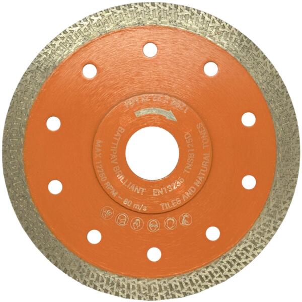 Kiváló minőségű gyémánttárcsa különböző porcelánlapok és természetes kő száraz vágásához. Átmérő: 125 mm; furat: 22,23 mm; szegmensmagasság: 10 mm; Cikkszám: TNSB125D