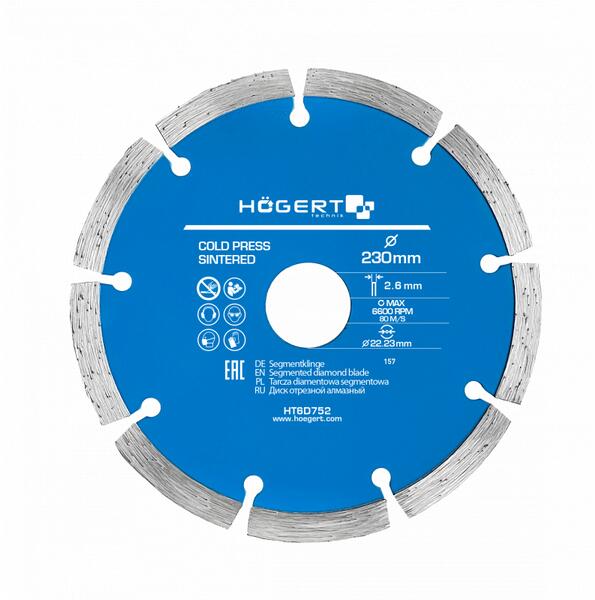 Kerámia csempék, természetes kő, beton és tégla vágására. Átmérő: 230 mm Tárcsa geometria: Folyamatos Szegmens alakja: Turbo Szegmens magasság: 10 mm Furat: 22.2 mm