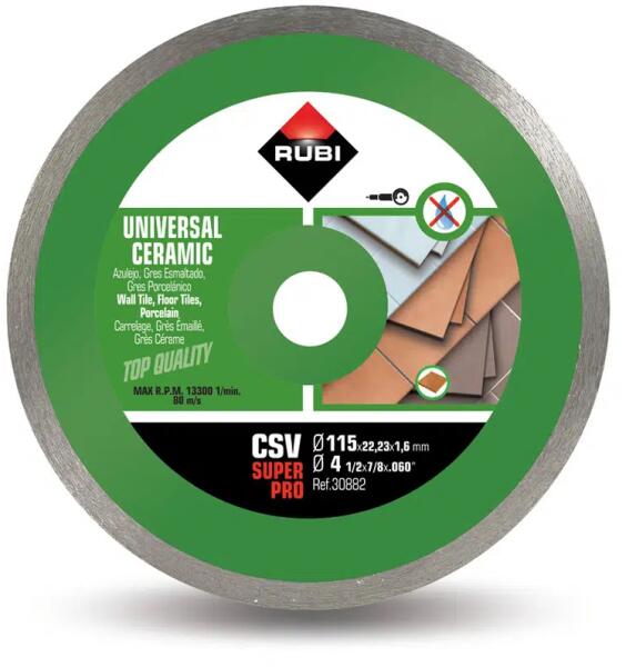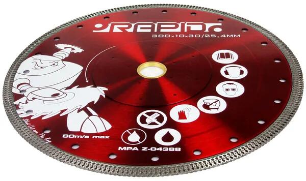 Különböző kerámialapok száraz vágására tervezett gyémánt vágókorong. Átmérő: 115 mm; lyuk: 22,2 mm; szegmensmagasság: 7 mm; szegmensszélesség: 1,6 mm. Ref: 30882