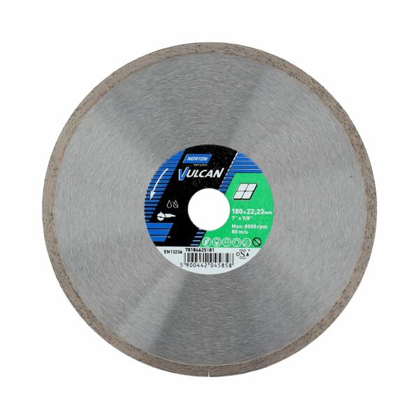 Norton Vulcan Ceramic szinterezett gyémánt vágókorong folyamatos vágóéllel. Kerámia anyagok, például kerámialapok, csempe, terrakotta, kőedények, klinker vágására tervezték vizes vágáshoz. Sarokcsiszolókhoz és csempevágó gépekhez egyaránt alkalmas. MŰSZAKI ADATOK Gyártói cikkszám: 70184625181 Átmérő: 180 mm Furat: 22,23 mm Szegmens magasság: 7 mm Szegmens széless