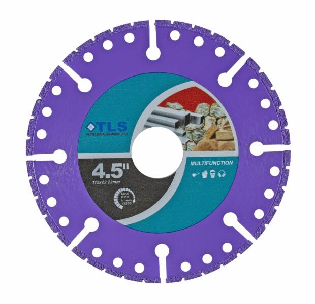 TLS MULTI-PRO-2 gyémántszemcsés vágókorong fémekhez és általános vágási célokhoz Átmérő: d=115 mm Furatátmérő: d=22.23 mm Vágószegmens magasság : 10 mm Vágó szegmens vastagság: 1.2/2.2 mm Alkalmazás: száraz Alkalmazási terület: szögvas, betonacél lemez, betonacél, koracél, alumínium, rozsdamentes acél, gránit, beton, kemény műanyagok, fa, márvány, acél, fém