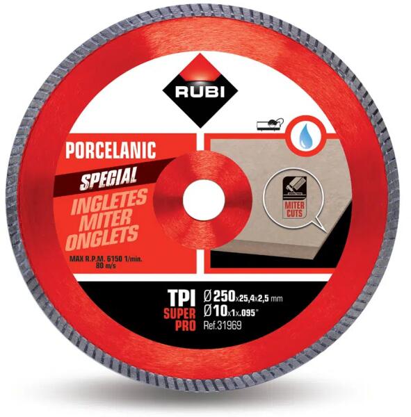 Porcelánlapok nedves vágásához. Tárcsa átmérője: 250 mm; furat: 25,4 mm; szegmens hossza: 7,5 mm; szegmensvastagság: 2,5 mm. Ref: 31969
