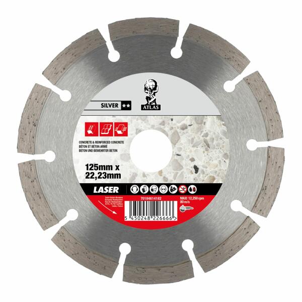 Atlas Laser gyémánt vágókorong kiváló minőségű anyagból készült, megnöveli az élettartamot és a teljesítményt. Száraz és nedves vágáshoz tervezve. A szegmentált profilnak és a lézer hegesztésnek köszönhetően a vágókorong könnyen megbirkózik a különféle kemény anyagok vágásával, anélkül, hogy hosszú időn keresztül elveszítené tulajdonságait. Minőségi
