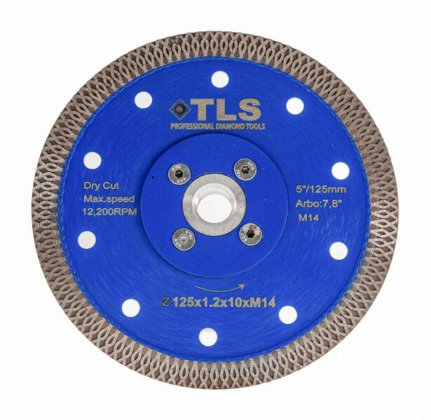TLS X-PRO M14 TURBO ultravékony gyémánt vágókorong Átmérő: d=150 mm Furatátmérő: d=M14 mm Vágószegmens magasság : 10 mm Vágó szegmens vastagság: 1.6 mm Alkalmazás: száraz és vizes használat Alkalmazási terület: Gres, kőporcelán, kemény kerámiák, gránit, márvány, csempe, kemény anyagok, tégla, egyéb építőipari anyagok, stb. TLS X-PRO TURBO ULTRAVÉKONY GYÉMÁNT