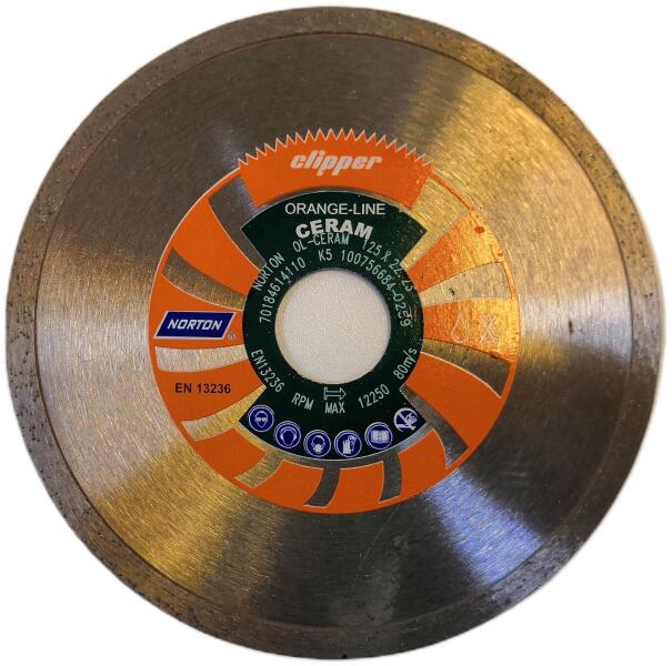 A Norton Clipper Orange Line Ceram gyémán vágókorong kerámia, gránit, márvány, pala és kőlapok vágására képes. Ezt a folyamatos élű gyémántlapátot száraz és nedves vágásra tervezték sarokcsiszolókhoz, csempevágó gépekhez és vizesvágókhoz. MŰSZAKI ADATOK Gyártói cikkszám: 70184614111 Átmérő: 180 mm Furat: 22,23 mm Szegmens magasság: 7 mm Szegmens szélesség:
