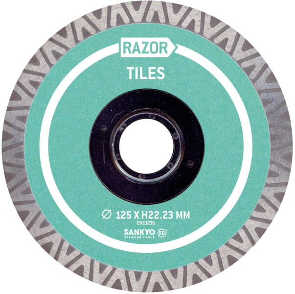 Sankyo 125 Turbo kő/csempe Megnevezés: Gyémánttárcsa csempéhez- természetes kőhöz #Típus: RAZOR #Leírás: Magas szegmensekkel rendelkező turbó tárcsa burkolóanyagokhoz A speciális kialakítású turbóminta szép vágást eredményez. Száraz használatra is alkalmas de vízhűtéses használat esetén növeli a tárcsa élettartamát. #Tárcsa átmérő: 125 mm#Furatátmérő: 22,