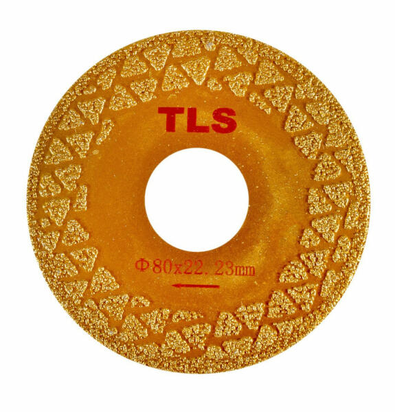 TLS VACUUM 2 SIDE TRIANGLE GOLDEN vákuum forrasztott gyémánt vágó- és csiszolótárcsa 2 oldalas Átmérő: d=80 mm (22.23 mm furat) Alkalmazás: száraz és vizes Szegmensvastagság: 2.5 mm Szemcseméret: durva ( #30/40 ) Alkalmazásiterület: Márvány, beton, műkő, sírkő, kerámia, normál gránithoz használható, ( kemény gránithoz viszont nem ajánlott! ) TLS ELECTROPLATED galvan