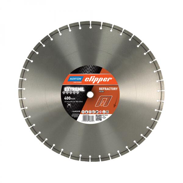 A Norton Clipper Extreme RC400 gyémánt vágókorongok nagyon jó szerszámok, amelyek lehetővé teszik a tűzálló anyagok gyors és kényelmes feldolgozását. Nem csak hatékony, hanem nagyon kényelmes munkát is nyújtanak. A Norton Clipper Extreme RC400 lézerhegesztett vágókorong elektromosan megolvasztott anyagokhoz alkalmas. Felhasználás: Corhart ZAC, Corhart 104, cirkónium, Jarga
