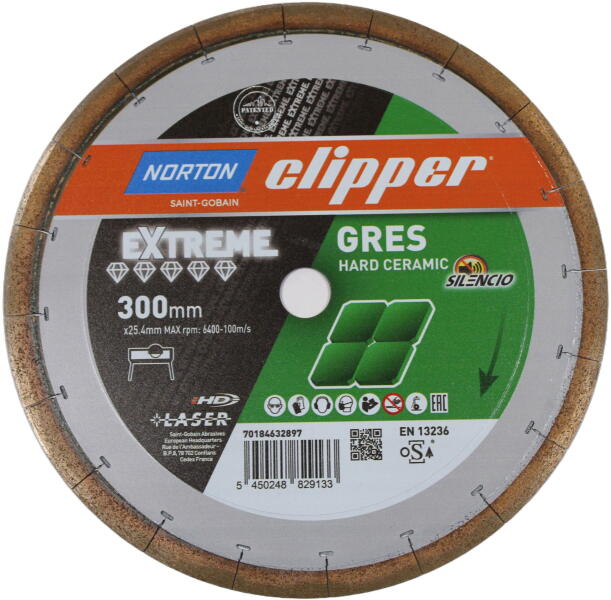 Nagy teljesítményű lézerhegesztésű gyémánt vágókorong 12 mm magas szegmenssel és hosszú élettartammal a nedves vágáshoz. A vágókorong vizesvágókhoz és falvágókhoz alkalmas 15 kW kimenő teljesítményig. Az új technológiának köszönhetően a Norton Clipper gyémánt pengék lényegesen hosszabb élettartamot és vágási sebességet eredményeznek gyakorlatilag minden any