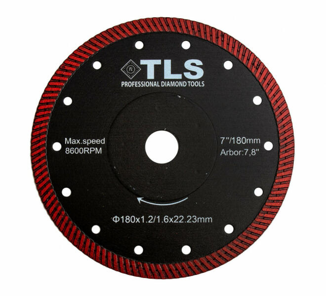 TLS SUPERTHIN-PRO TURBO szupervékony gyémánt vágókorong Átmérő: d=125 mm Furatátmérő: d=22,23 mm Vágószegmens magasság : 10 mm Vágó szegmens vastagság: 0.8/1.2 mm Alkalmazás: száraz és vizes használat Alkalmazási terület: Gres, kőporcelán, kemény kerámiák, gránit, márvány, csempe, kemény anyagok, tégla, egyéb építőipari anyagok, stb. TLS SUPERTHIN-PRO TURBO SZU