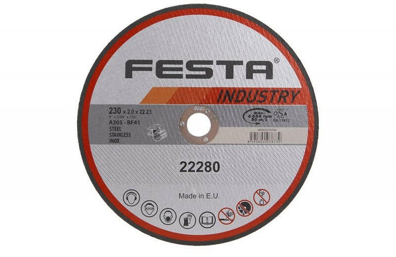 Professzionális vágótárcsa fémhez, öntöttvashoz, rozsdamentes acélhoz. Aldehid alapú műgyantás kötőanyaggal készült, a megnövelt szilárdság és biztonság érdekében kétrétegű üvegtextillel megerősítve A FESTA professzionális vágótárcsák megfelelnek az EN 12413-nak szabványnak és az OSA homologizációnak.