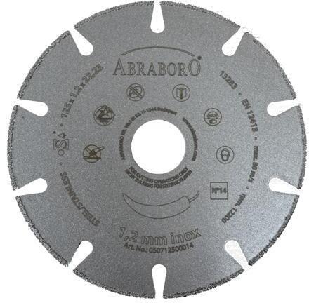 ABRABORO INOX gyémántszemcsés vágókorong No. 14 Extra vékony szegmenses vágótárcsa acél alaplappal, a szegmenseken nagy mennyiségű prémium minőségű gyémántszemcsével Szikra- és porszegény Alacsony vibrációs sznt, kecesebb tárcsatörés Prémium kategória Ajánlott: acél, rozsdamente acél, acélöntvény, szendvics anyagok vágásához 50 x hosszabb élettartam a hagyomá