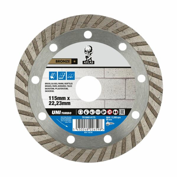 Az Atlas Universal Turbo gyémánt vágókorongot sarokcsiszolóval való használatra tervezték. Bordázott turbó szegmens, szinterezett tárcsa. Alkalmas beton, vasbeton, tégla, cserép, gránit, építőanyagok, természetes és műkő megmunkálására. Kiváló minőségű anyagból készült, megnövelt erőforrással és teljesítménnyel. Száraz és nedves vágáshoz tervezve. A Turbo