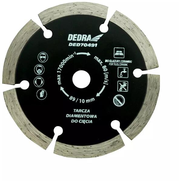 Szegmentált gyémántpenge beton, tégla, klinker, természetes és mesterséges kő vágásához. Alkalmas akkumulátoros és 230 V-os hálózatról táplált gépekhez. A penge kis átmérője (89 mm) lehetővé teszi, hogy nagyon magas fordulatszámon (akár 17 000 fordulat/perc) működjön, ami nagy lineáris sebességet eredményez a hatékony vágás érdekében. ADED7049 kézifűrésszel
