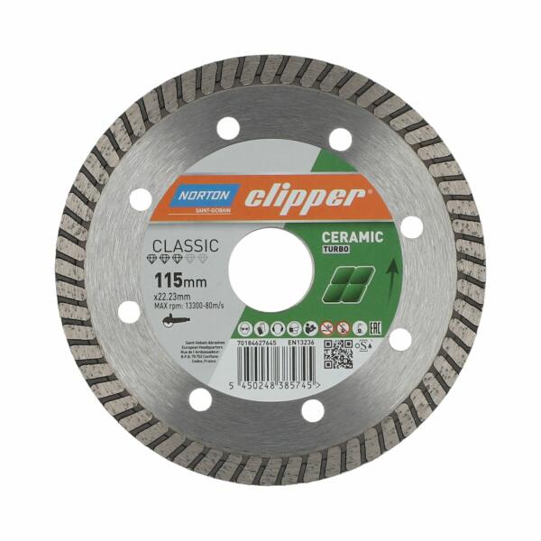 A Norton Clipper Classic Ceramic Turbo-t kifejezetten a kemény kerámialapok gyors és egyenletes vágására fejlesztették ki. A tárcsa különösen alkalmas sarokcsiszolókhoz, porcelán és kerámialapok száraz és nedves vágására készült. Ennek a gyémánt vágótárcsának kiemelkedő tulajdonsága a Turbo Jet szinterezett, zárt vágóél. Ez az él gyors és sima vágást tesz lehe