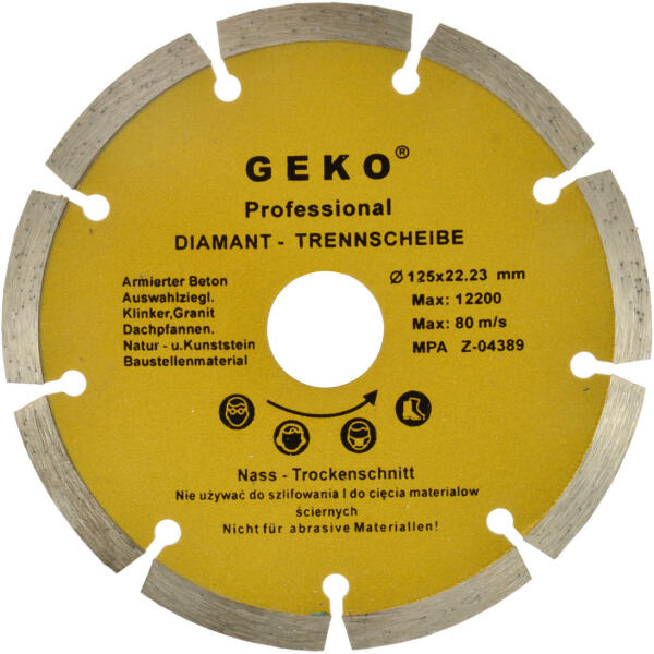 Gyémántkorong SEGMENT 125 x 8 x 22,2 mmGyémántkorong 125 mm-es átmérővel építkezési anyagok megmunkálásához (vasbeton, tégla, kerámia, márvány, kőzet, gránit... ). A korong nikkel acélból készült réz hozzáadásával, ami növeli az ellenállóképességet a repedésekkel szemben, lehetővé teszi az akár 80 m/s sebesség elérését. Technikai paraméterek:Átmérő: 125