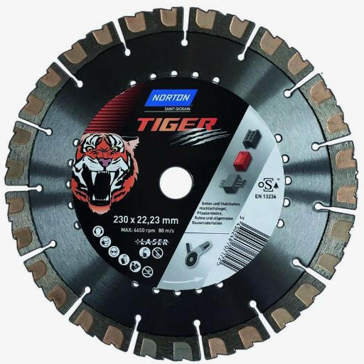 A Norton TIGER BETON gyémánt vágókorong egy lézerrel hegesztett gyémánt tárcsa, amelynek szegmensmagassága 12 mm és lyukakkal rendelkezik a hordozó jobb hűtéséhez, sarokcsiszolók általános építési termékei számára száraz és nedves használatra. Felhasználás: általános építőanyagok, mint például beton, betoncsövek, szegélyek, poroton, mészhomok tégla, ytong, te
