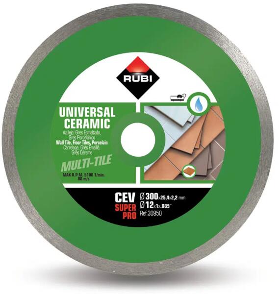 RUBI gyémánttárcsa kerámialapok nedves vágásához. Átmérő: 300 mm; furatátmérő: 25,4 mm; szegmensmagasság: 10 mm; szegmensvastagság: 2,2 mm. Ref: 30950