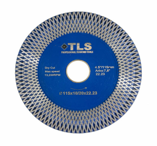 TLS W-PRO TURBO ultravékony 10/20 szegmenses 2 oldalas gyémánt vágó- és csiszoló korong Átmérő: d=115 mm Furatátmérő: d=22,23 mm Vágószegmens magasság : 10 mm egyik oldalon és 20 mm a másik oldalon Vágó szegmens vastagság: 1.6 mm Alkalmazás: száraz és vizes használat Alkalmazási terület: Gres, kőporcelán, kemény kerámiák, gránit, márvány, csempe, kemény anyagok,