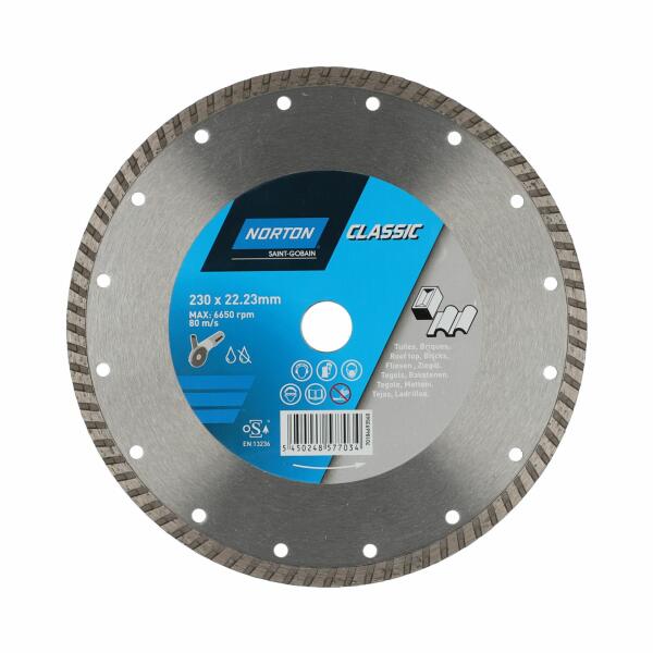 A Norton Classic Bricks & Clay roof tiles 7 mm magas folyamatos peremű, barázdált gyémánt vágókorong. Jó vágási teljesítmény, sima vágás a legjobb eredmény érdekében. Törékeny vagy közepesen kemény építőanyagok, tégla, cserép, kő és más építési anyagokhoz ajánlott. MŰSZAKI ADATOK Gyártói cikkszám: 70184693560 Átmérő: 230 mm Furat: 22,23 mm Szegmens magas