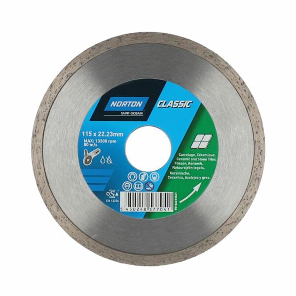 A Norton Classic Ceramic & Porcelain Tiles folyamatos peremű gyémánt vágókorong, kifejezetten kerámialapok, és porcelán csempék vágásához. A folyamatos peremnek köszönhetően, szép rojtosodás mentes vágást tesz lehetővé. Alkalmas kemény kerámia burkolólapokhoz is. MŰSZAKI ADATOK Gyártói cikkszám: 70184693561 Átmérő: 115 mm Furat: 22,23 mm Szegmens magasság: 7 mm