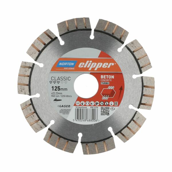 A Norton Clipper Classic Asphalt egy költséghatékony gyémánt vágókorong, amelyet kifejezetten száraz vagy nedves vágáshoz terveztek. Ez a tárcsa különösen alkalmas aszfalt, aszfaltbeton, friss beton, csiszolóanyagok és beton tetőcserepek vágására. A tárcsa úgy lett kialakítva, hogy megfeleljen a közepes terhelésű vágási munkák követelményeinek. Jó kombinációját k