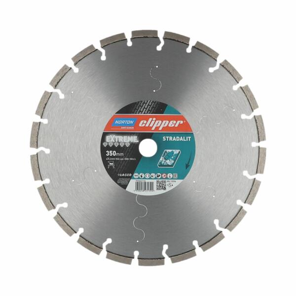 A Norton Clipper Extreme Stradalit egy erős nedves vágókorong, amelyet nagyon kemény természetes kő, edzett járólapok, klinker téglák, homlokzati téglák és építőtéglák vágására terveztek. A vágókorong kiemelkedő jellemzői közé tartozik a lézerrel hegesztett 10 mm magas szegmens és a csendes acélmag. A tárcsa 10 mm magas szegmense jobb vágási teljesítményt és tar